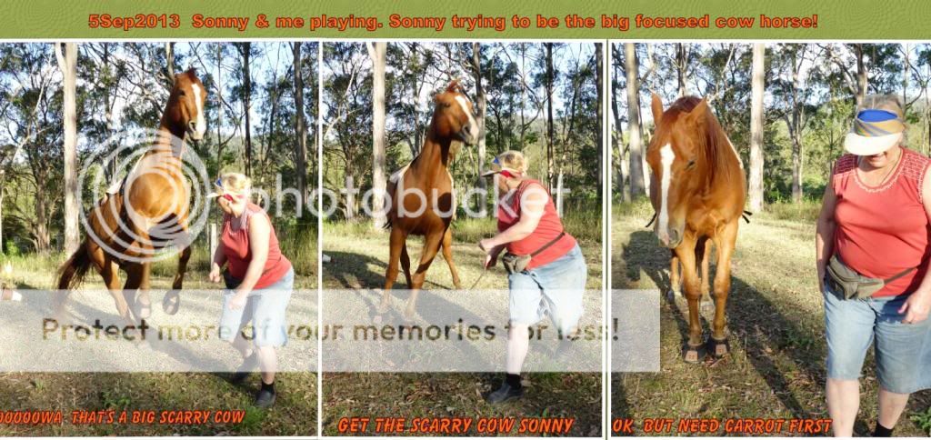 The big bad cow (me) kept moving away & he had to knuckle down & do some moving to get infront of me to turn me back. Of course as far as Sonny is concerned that's just an excuse for more rearing which he loves doing! But when all is said & done there's nothing like a nice snack of carrot rings after a hard 'cutting' session! But you can see from his deadly stare that he truly means business.